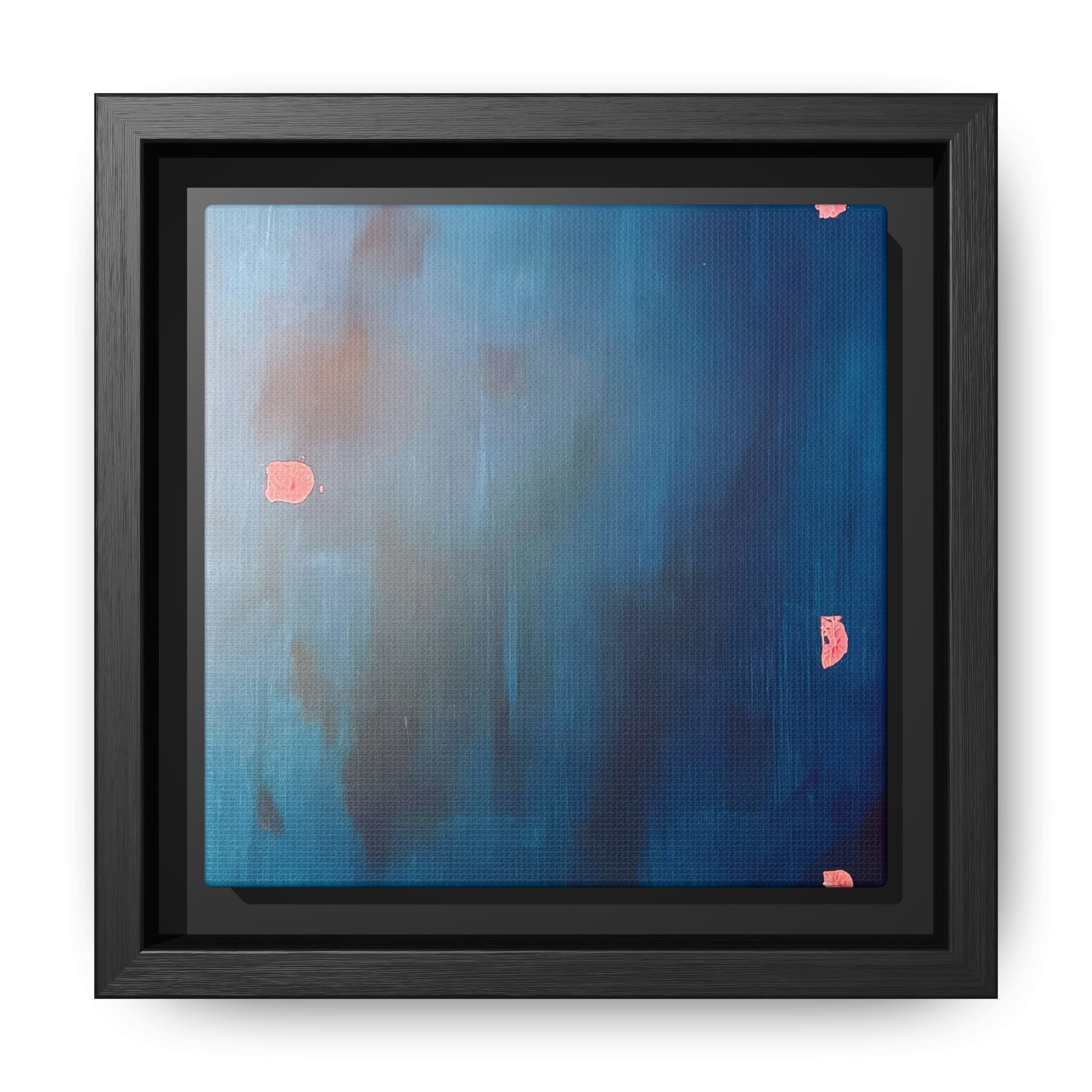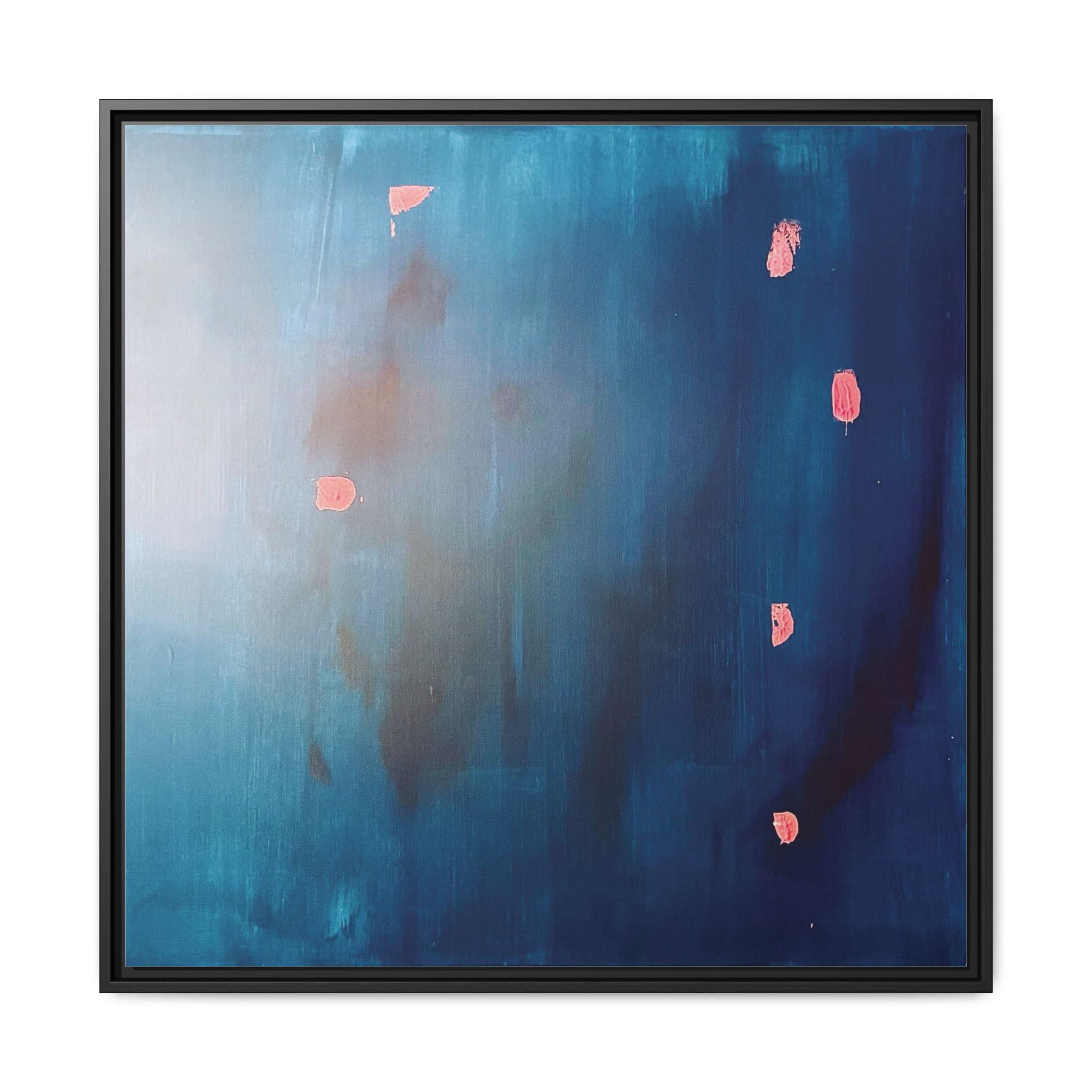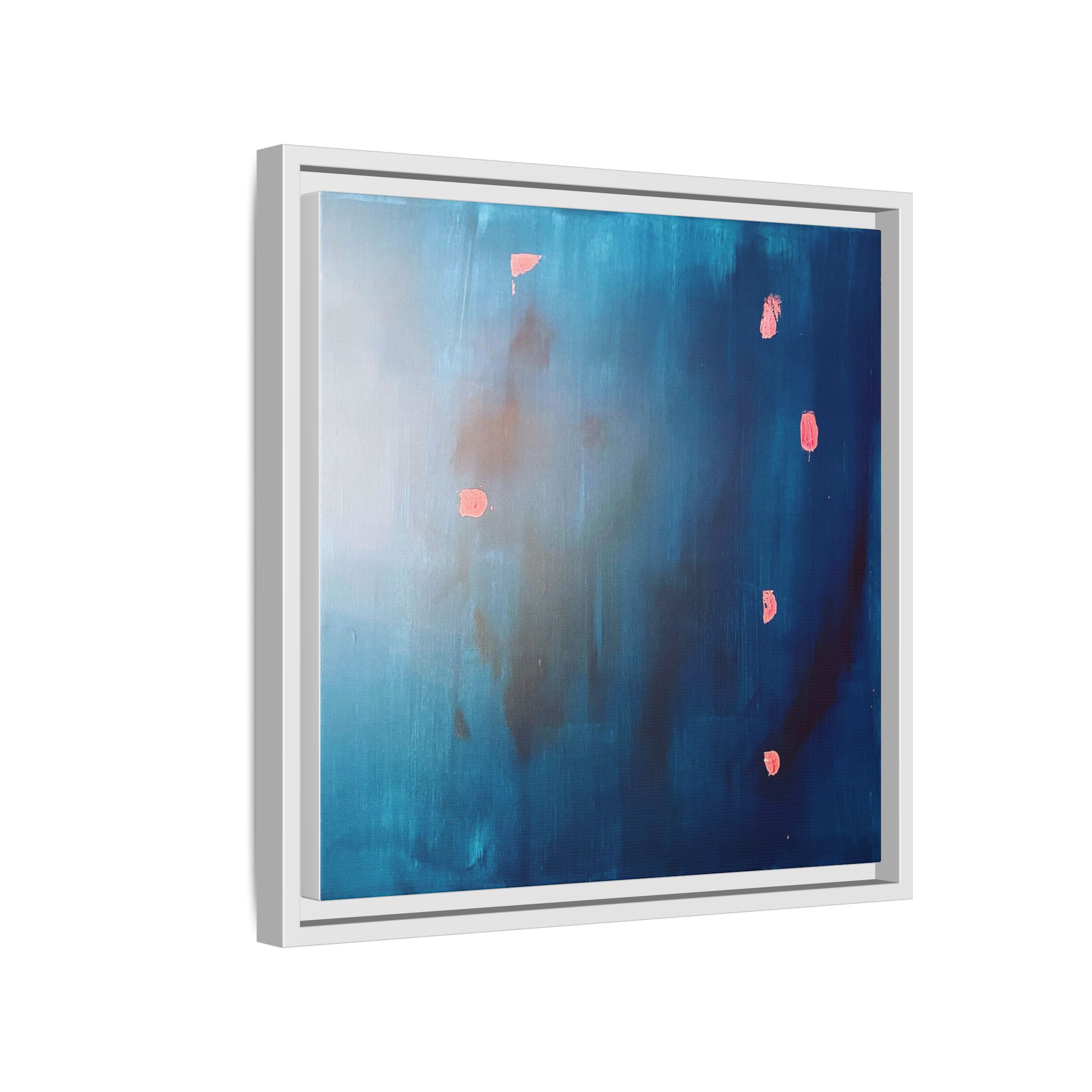 but only just. A deep, moody blue stretches across the canvas like night sky over an empty city, soft brushstrokes barely breaking the surface. Scattered across it, bright pink fragments float — like petals, or maybe evidence — small, raw, impossible to ignore.