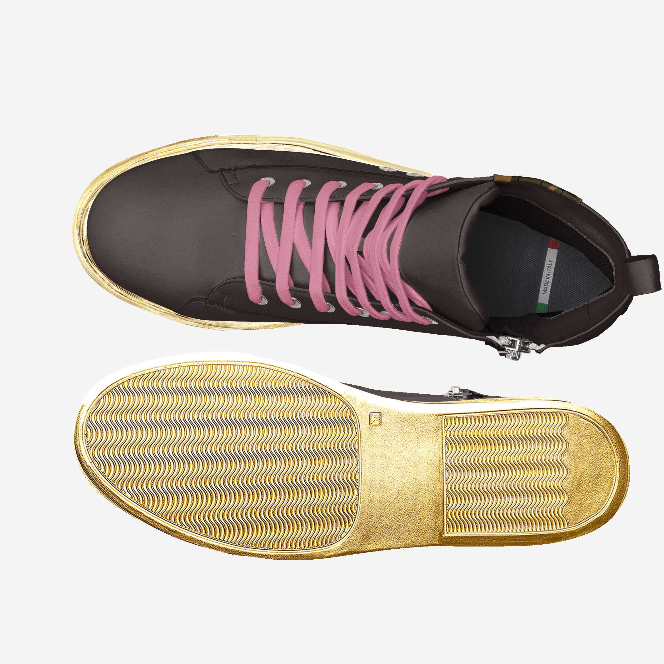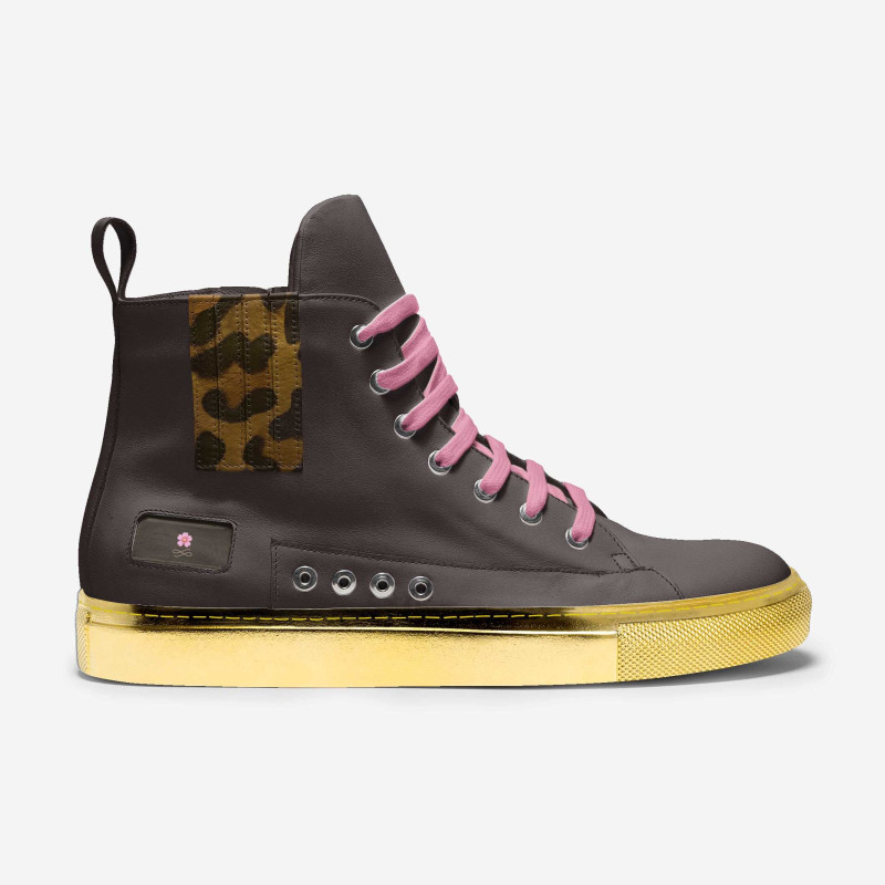 ◦ Metallic gold sole elevates the sneaker with a luxurious finish.
