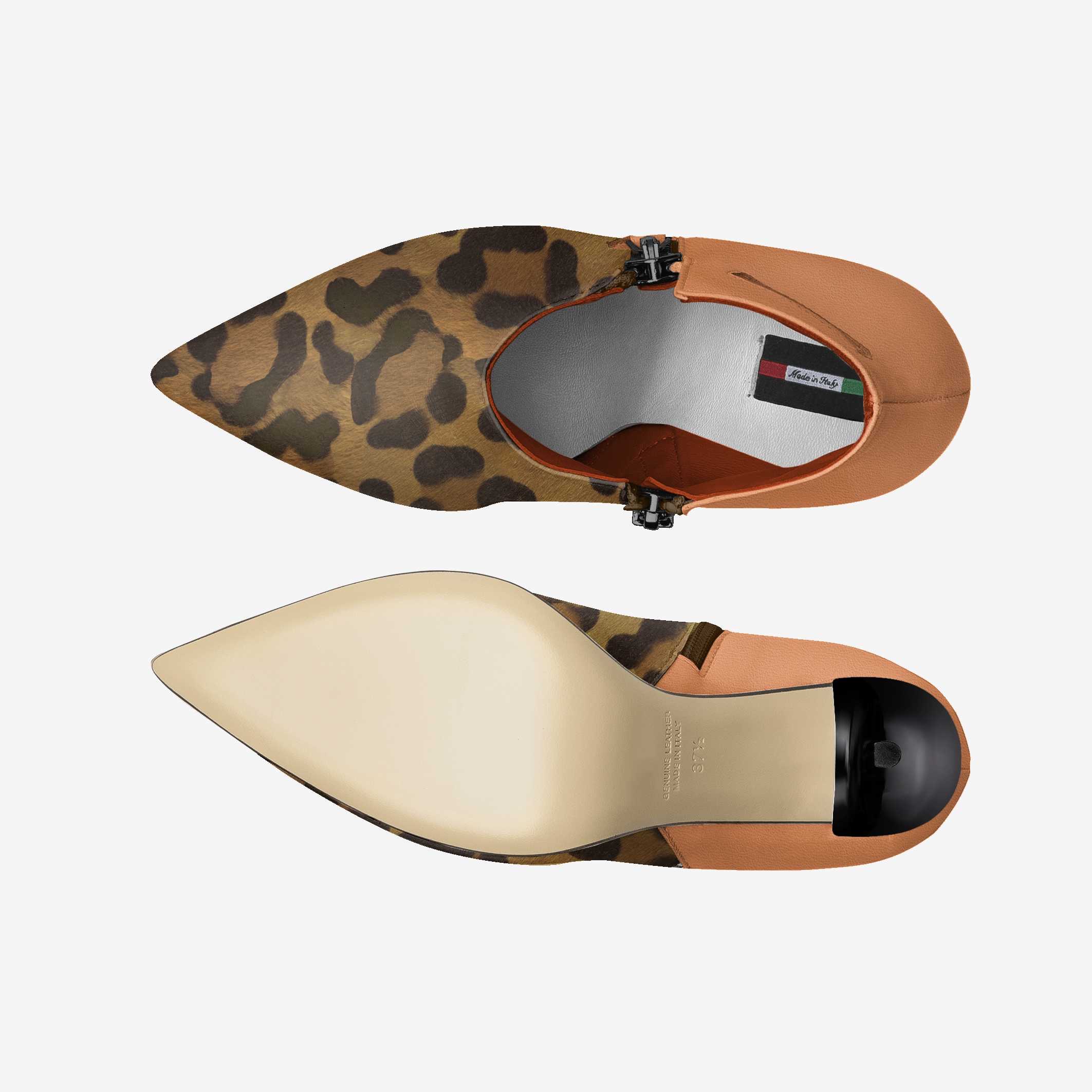 Smooth Italian leather in warm caramel hues wraps the heel, adding a sophisticated contrast.
