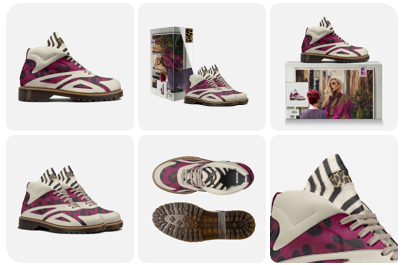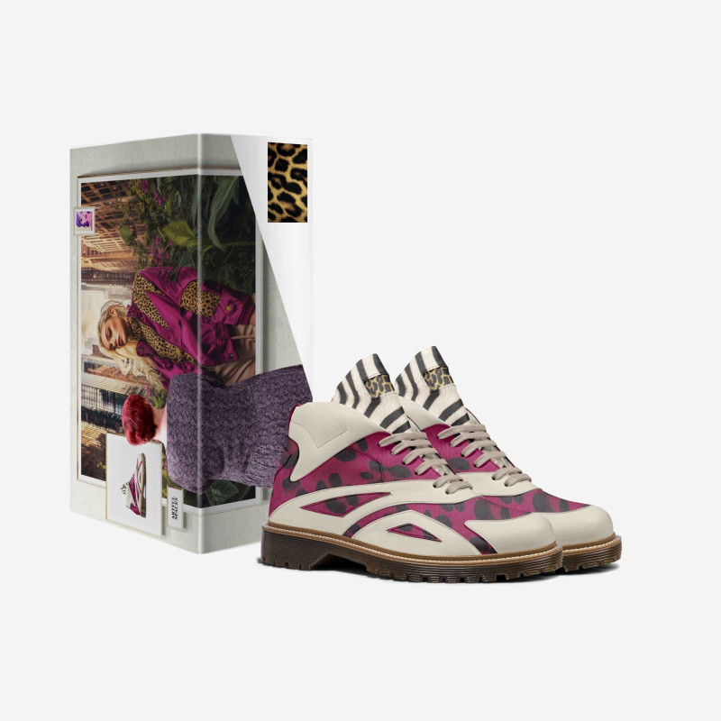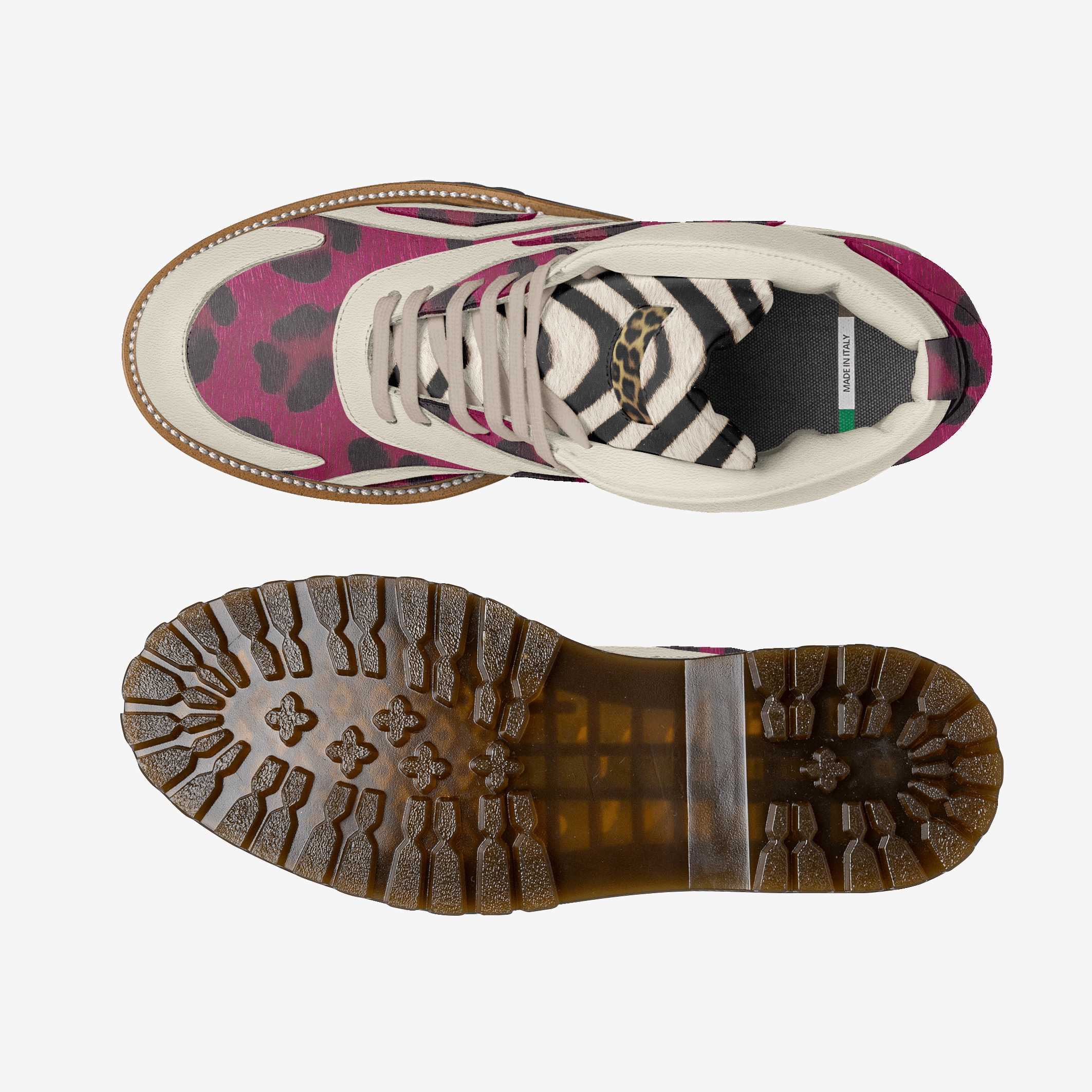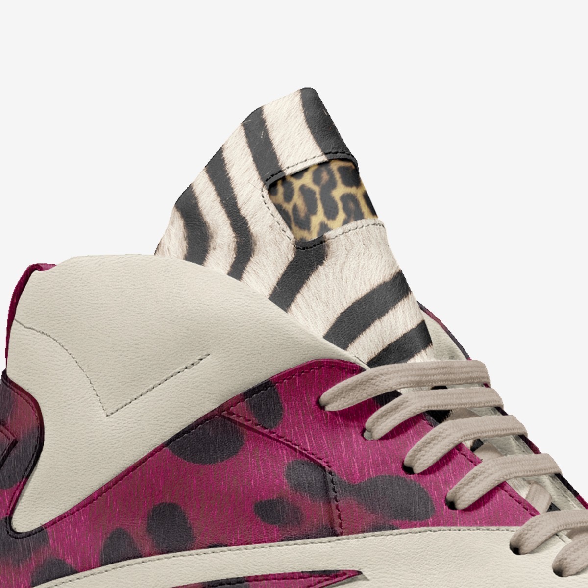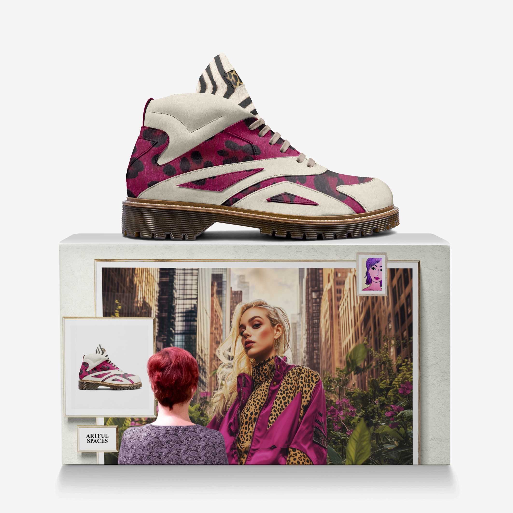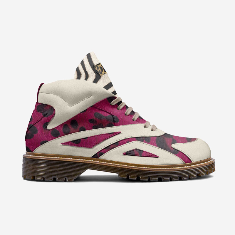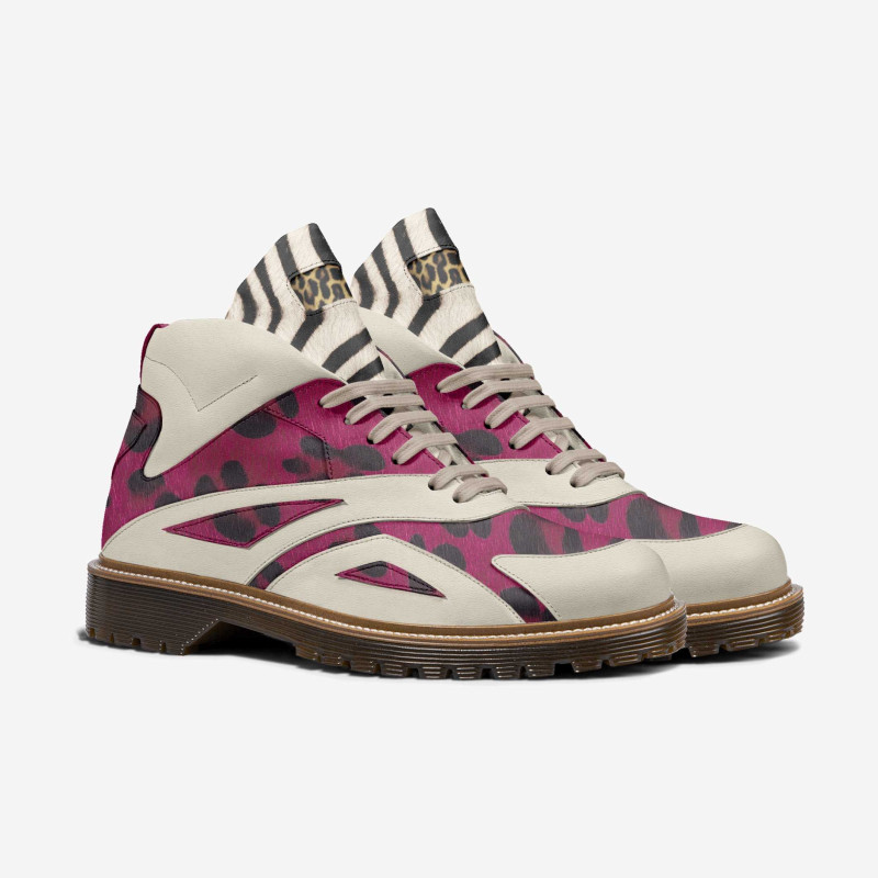 Vibrant berry-toned animal print contrasts elegantly with cream accents and a zebra-print tongue for a dynamic, bold aesthetic.