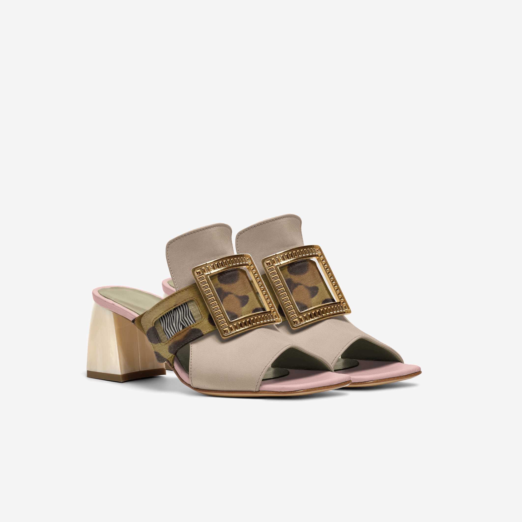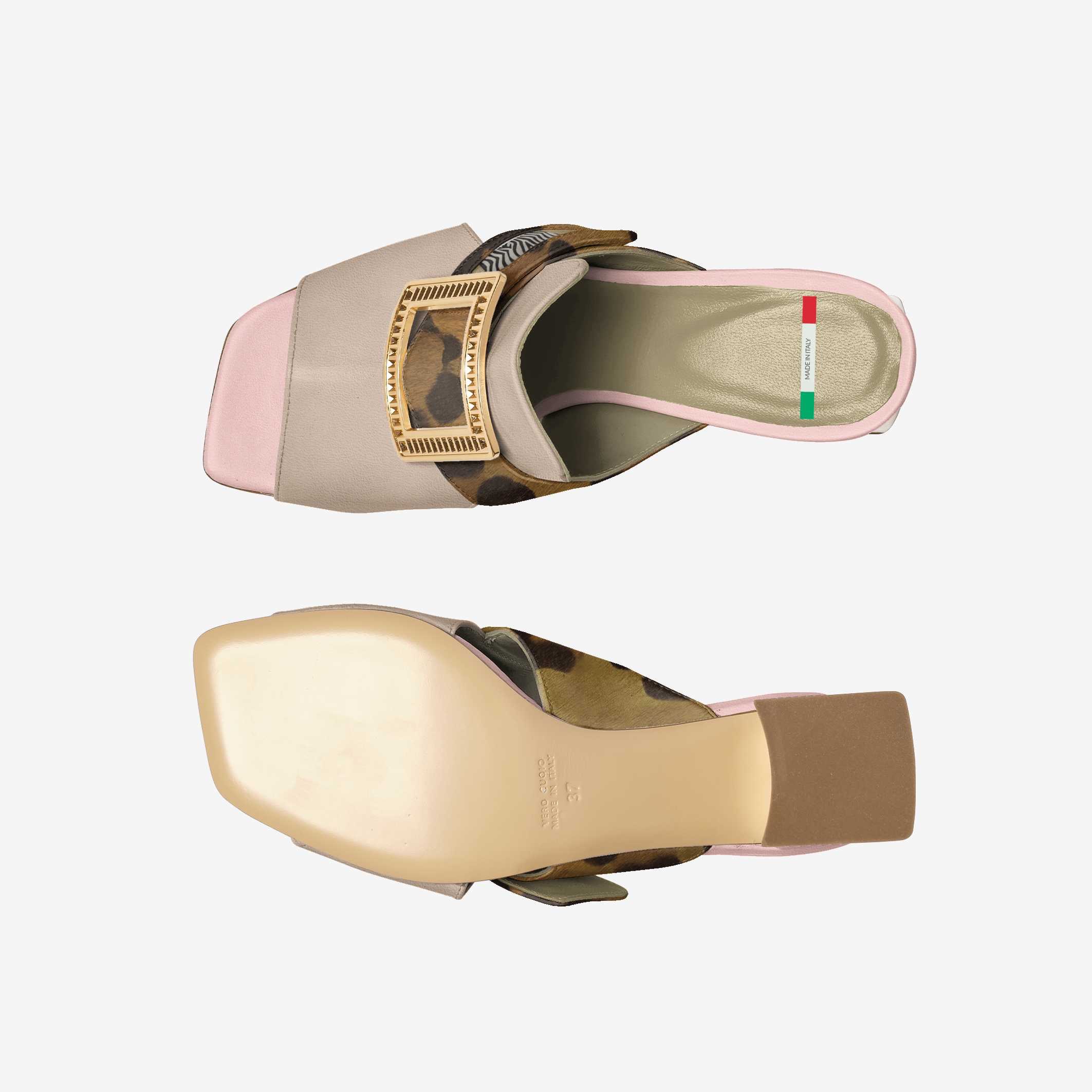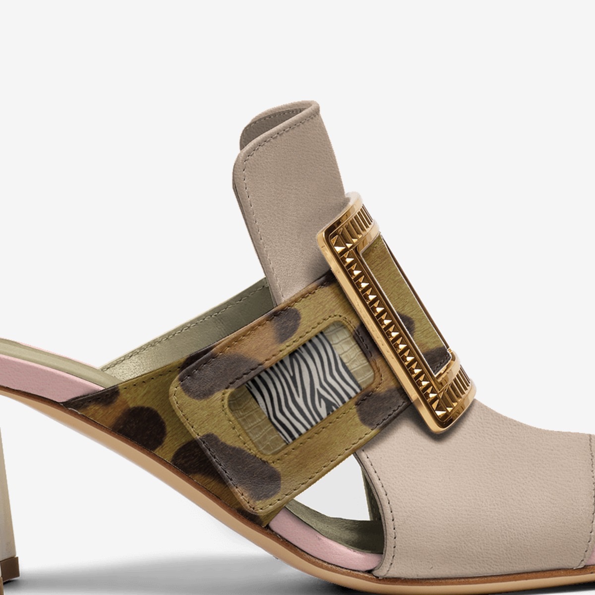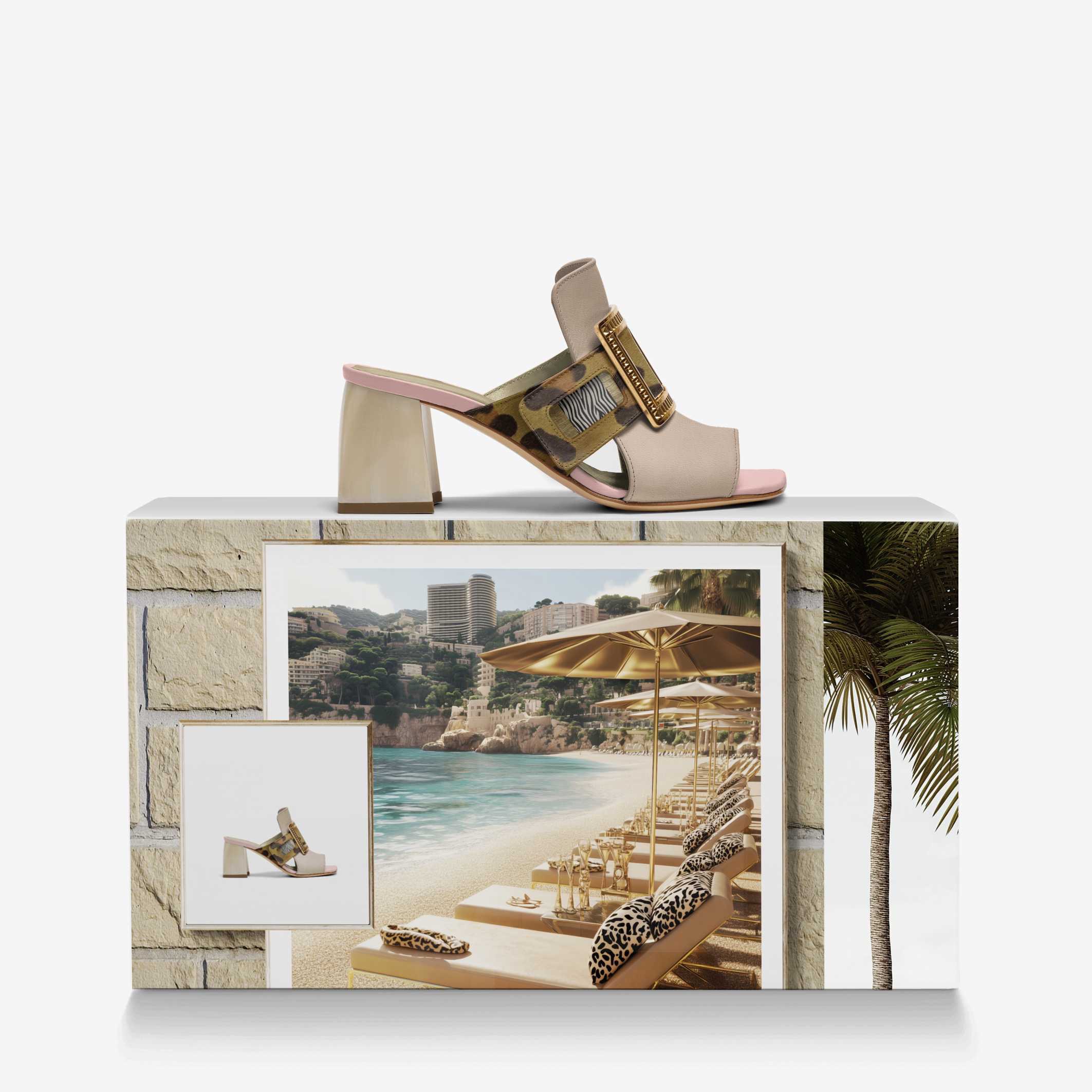 The Monaco Chic sandal is a harmonious blend of timeless style and modern boldness. Its captivating beige tones are beautifully contrasted with vibrant leopard and zebra patterns, while the gold-toned statement buckle creates a striking focal point.