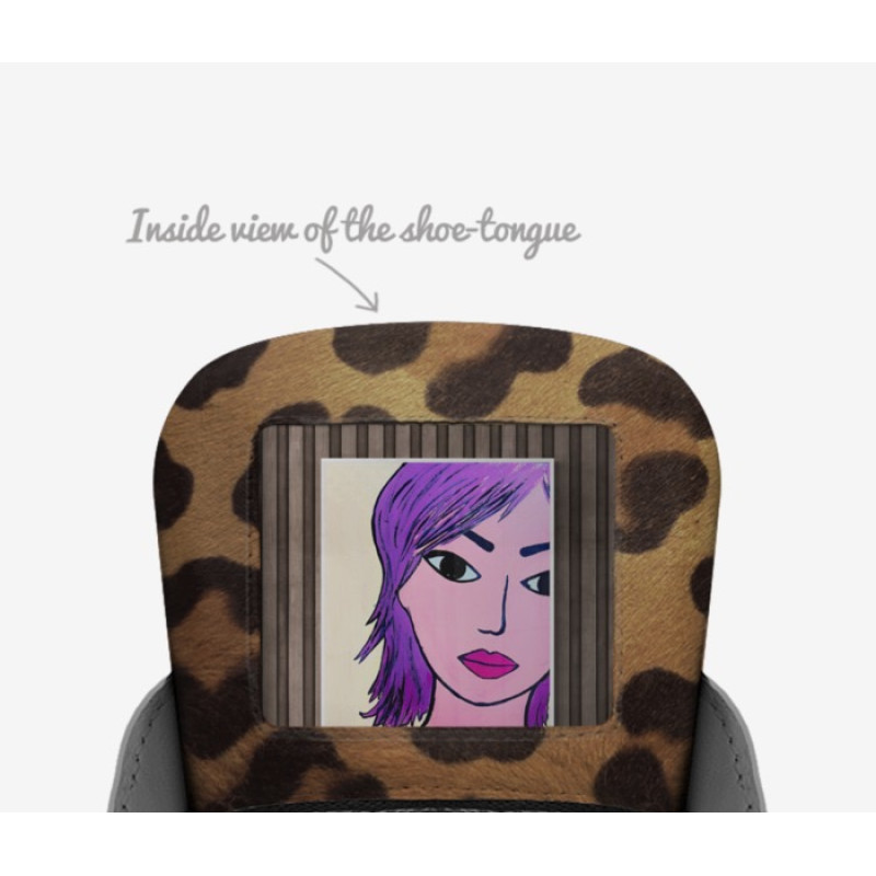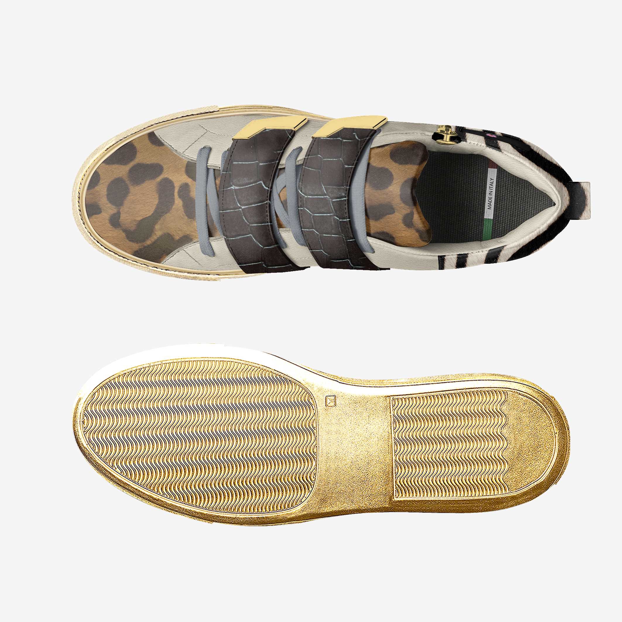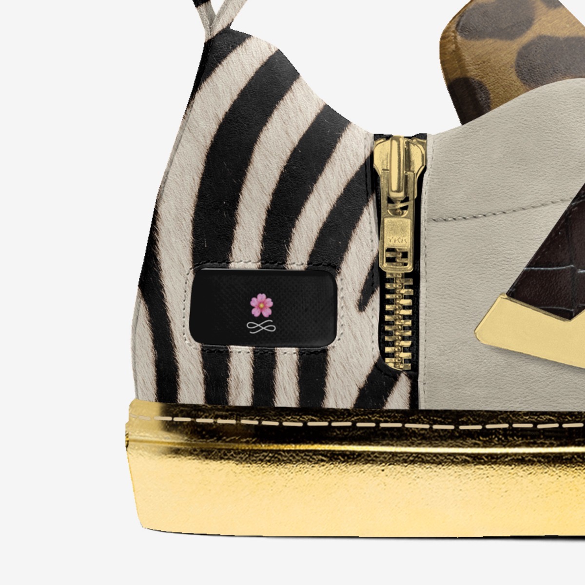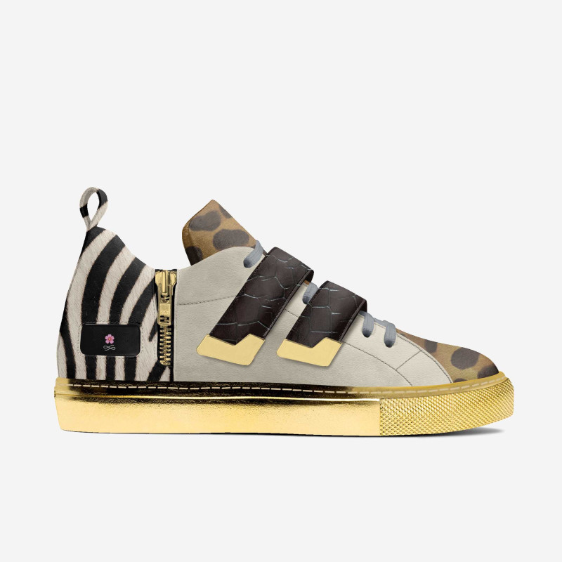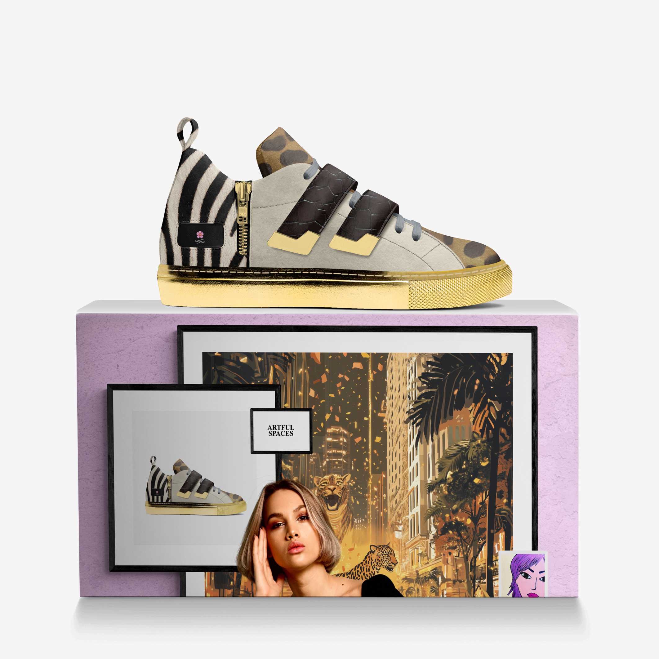 This striking sneaker masterfully blends daring patterns with sleek design, making it the ultimate companion for style rebels and trendsetters alike. From its zebra-striped details to the golden accents, every element of this shoe celebrates bold individuality.